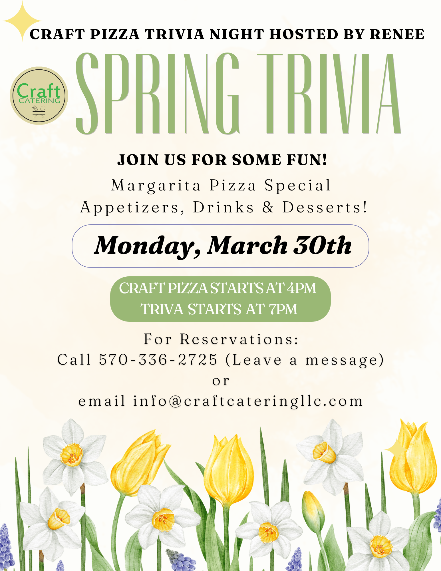 Join us for a special event during Craft Pizza Night for our Spring Trivia! Hosted and Emceed by Improv Royal Renee, great food, fun, and free to enter your team. Teams of 6 or less. TOP THREE TEAMS WIN PRIZES!! We recommend reservations! Call 570-336-2725 or email Jana at info@craftcateringllc.com to reserve for your team!
